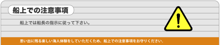 転落事故などを防ぐため船長の指示にしたがって下さい。乗船、下船の際は足下に十分気をつけて下さい。